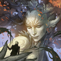 body of a human and the lower body of a tree, resembling a mermaid-like figure sitting atop a large tree with leaves in various shades of orange, yellow, and brown, which suggests that it might be autumn season. The tree's branches are sprawling, and its trunk appears gnarled and thick. Below the character, there is another individual who seems to be interacting or possibly communicating with the figure on top of the tree. The overall atmosphere of the image suggests a scene from