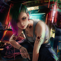 the video game Cyberpunk 2077 named Judy Alvarez. She is depicted in an intense or serious pose, with a background that suggests a cyberpunk-themed environment. Judy Alvarez has various tattoos and is styled with distinctive