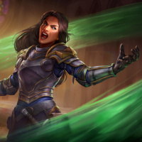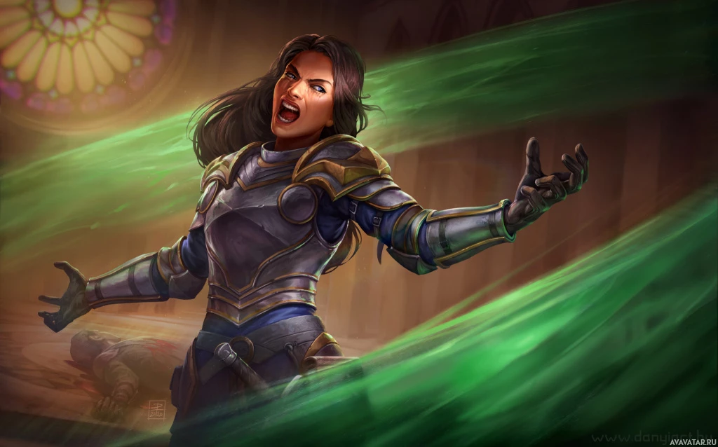 На картинке изображен анимированный персонаж, женщина-рыцарь или воин, стоящая в центре. Она одета в доспехи с гербом на шлеме, а ее правую руку окружает зеленая магическая энергия. Выражение ее лица кажется напряженным, что позволяет предположить, что она произносит заклинание или готовится к бою.