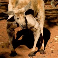 dirt ground. The kangaroo is in the foreground of the picture, and its head and body are clearly visible. It seems to be standing still and might be looking towards something out of frame, possibly alert or curious. There's vegetation in the background, which indicates that this scene could be taking place in