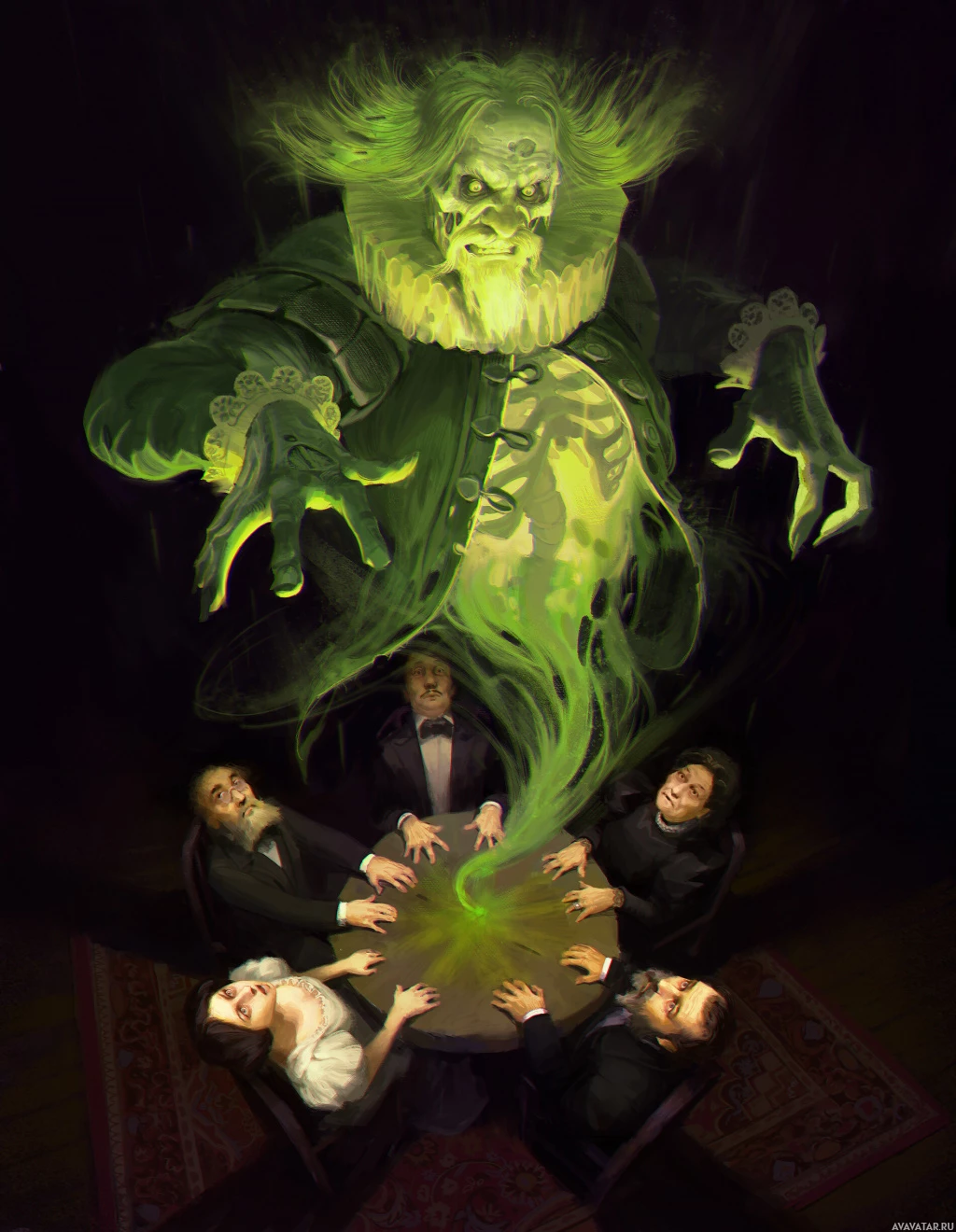 a supernatural entity. Surrounding this central figure are three individuals dressed in Victorian-