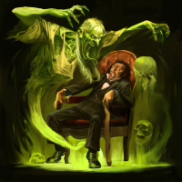 undead creature, which seems to be attacking or threatening the seated man. There are