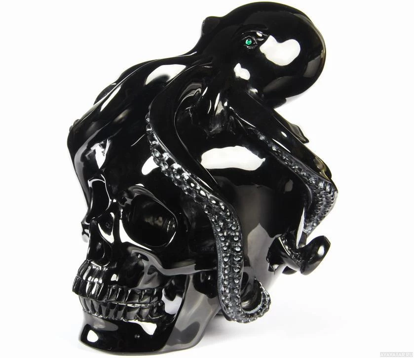 На картинке изображен череп в виде осьминога. Череп имеет обычные черты, такие как глазницы и зубы, в то время как осьминог, кажется, обвился вокруг шеи и плеч черепа в игривой или художественной манере.
