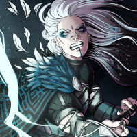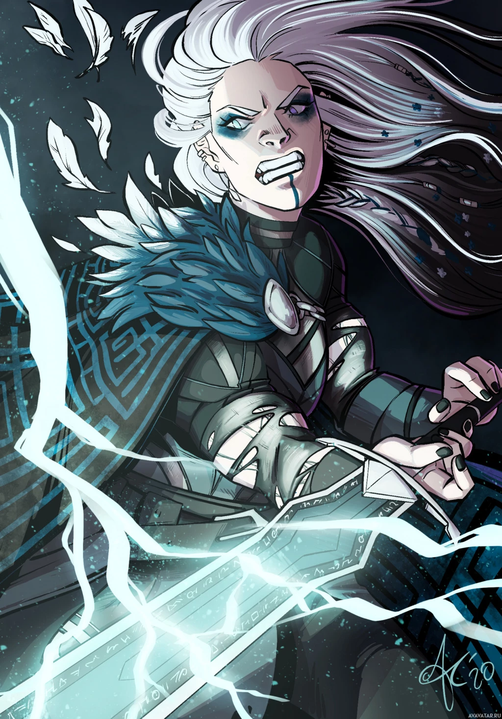 white hair and striking facial features. She is dressed in a fantasy-style garb that resembles a witch's or warrior's costume, complete with