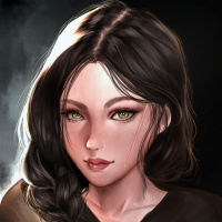 The image depicts an illustrated character of a young female with brunette hair. She is wearing what appears to be a cloak or robe, suggesting a fantasy or historical setting. Her expression is contemplative, and she has striking green eyes that add to her mysterious and thoughtful demeanor. The lighting in the image highlights her facial features, giving the artwork a dramatic feel.