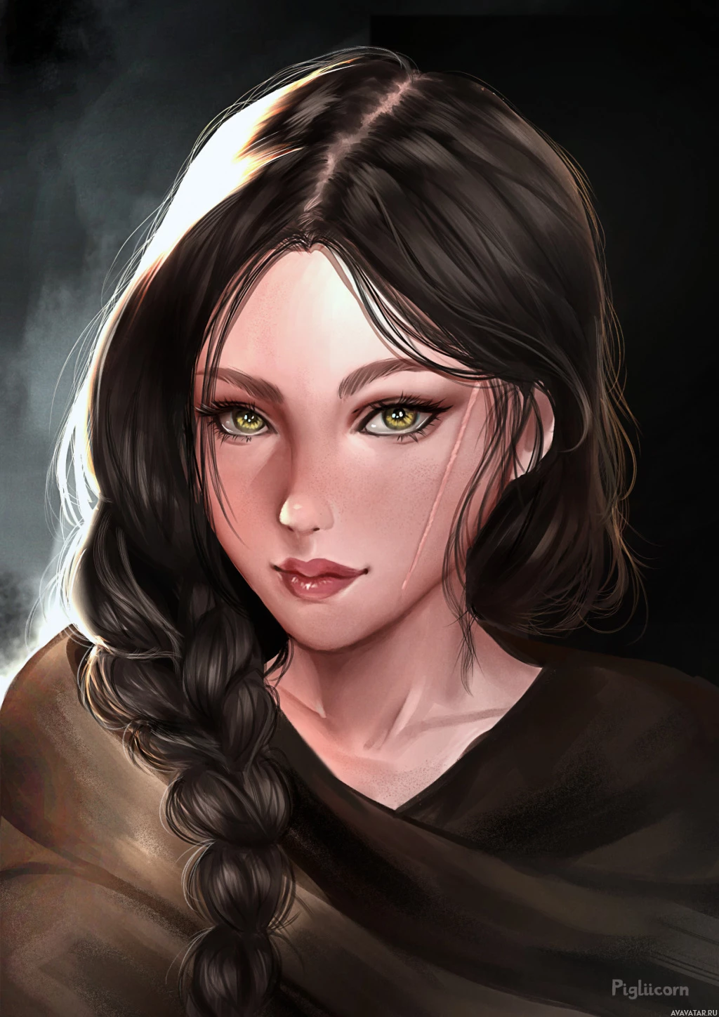 На картинке изображен персонаж в виде молодой женщины с темными волосами. Она одета во что-то похожее на плащ или мантию, что наводит на мысль о фантастической или исторической обстановке. Выражение ее лица задумчивое, а поразительные зеленые глаза придают ее поведению загадочность и задумчивость. Освещение на снимке подчеркивает черты ее лица, придавая произведению драматический вид.