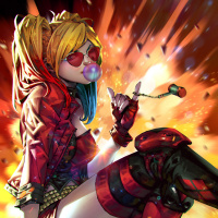 a bubblegum bubble, which adds to her whimsical and chaotic personality. The background suggests an explosive situation, with bright flames and smoke around her, which aligns with the character's often tumultuous nature in
