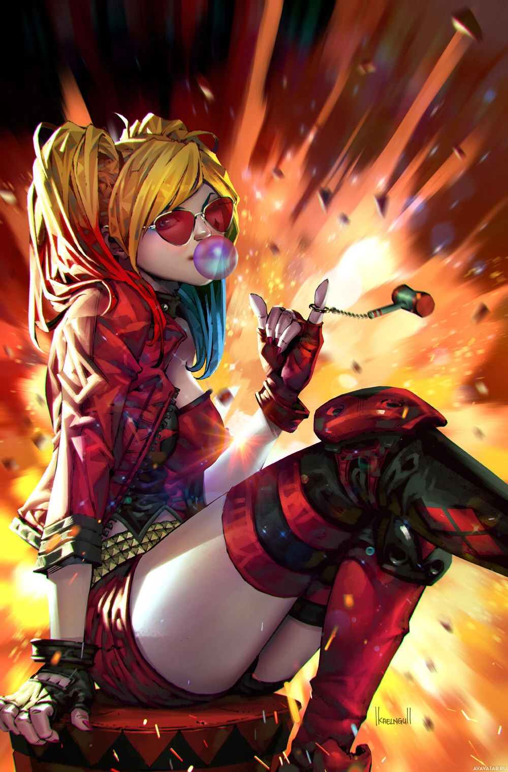 Harley Quinn, an iconic comic book villainess. She is depicted in her signature attire, consisting of