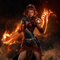 rocky terrain and appears to be casting or controlling fire, as there are flames around her hands. There's