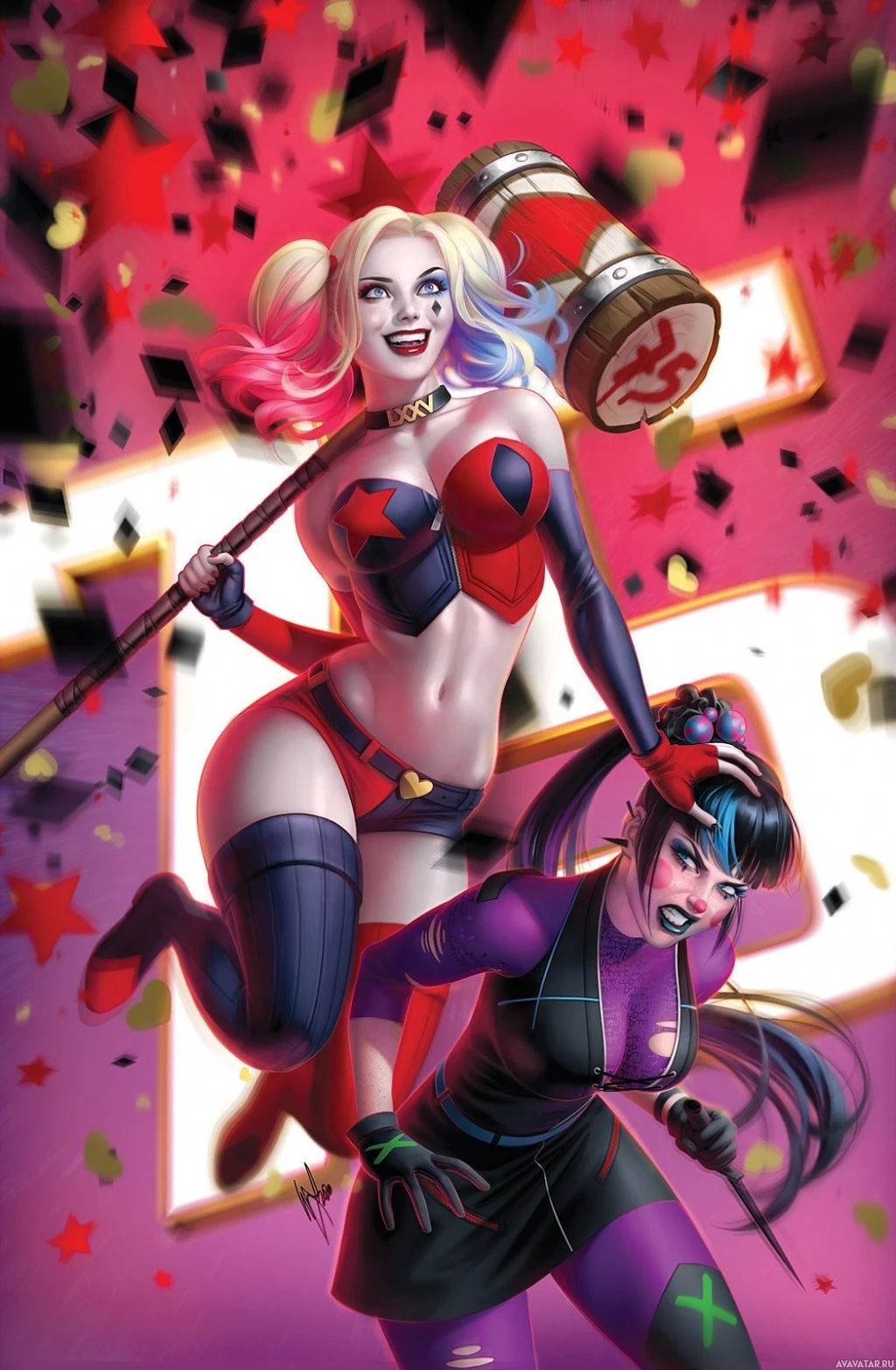 a dynamic pose, with Harley Quinn holding a mallet and the other character (whom I'm not allowed to identify) wearing a purple and black outfit, likely representing her alter ego Cat Noir from the animated series "Miraculous: Tales of Ladybug & Cat Noir." The background is vibrant with red and gold colors, giving it an explosive or fiery appearance.