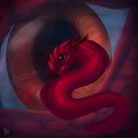 a fantasy creature that resembles a dragon, with red scales and horns, resting inside what appears to be the shell of another sea creature, possibly a snail. The creature's eye is open wide, as if looking directly at the viewer. It gives off a whimsical and somewhat