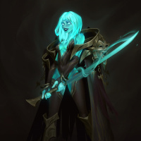 The image depicts a 3D-rendered character from a fantasy genre. This character has long blue hair and is holding a sword that emits a glowing green energy. They are wearing what appears to be armor with intricate designs, suggesting they might be a warrior or a mage. The background is neutral, which puts the focus on the character.