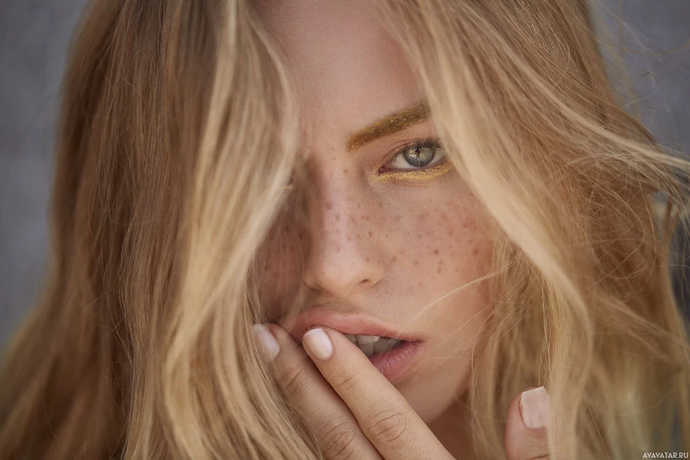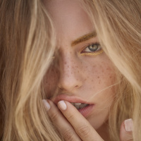 blonde hair. Her face is partially obscured by her hand, which she has placed on her mouth, possibly indicating surprise or contemplation. She has a noticeable freckle pattern and appears to be looking directly at the camera.