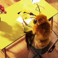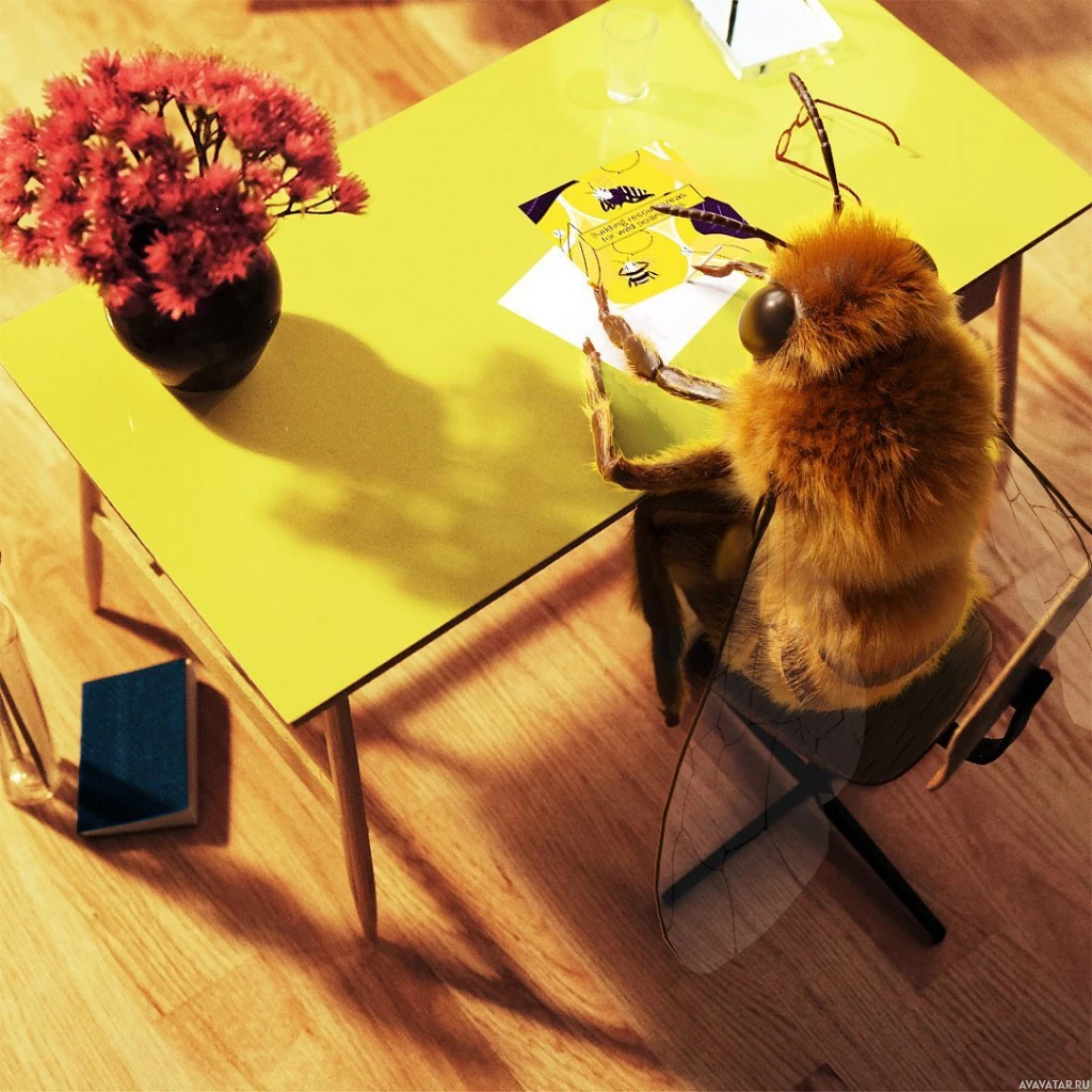 an indoor environment, possibly designed to look like a home office or workspace. The bee is seated in a chair, facing a desk with the items arranged on it. The scene depicted is whimsical and anthropomorphic, as bees do not possess