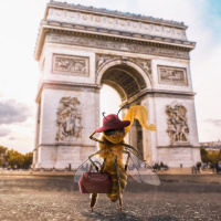 a red hat, walking in front of the Arc de Triomphe. The character is carrying a purse and has its wings outstretched as if flying. It's a playful and imaginative scene that combines elements of