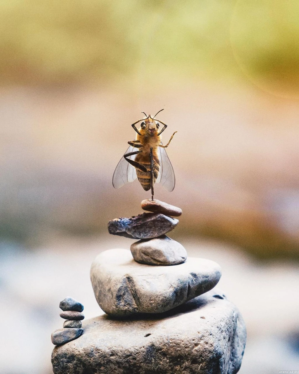 The image features a bee that appears to be standing or balancing on top of three stones, which resemble