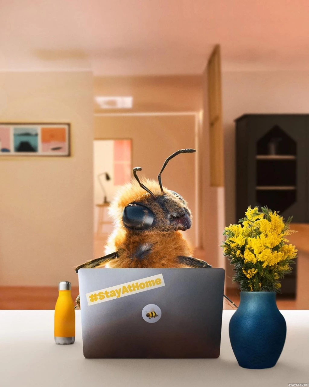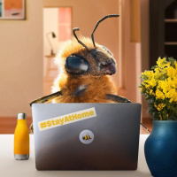 yellow flowers to the right of the laptop. Behind the laptop, there's a room with visible furniture and decorations. On the laptop, there are some stickers and text that say "#STAYATHOME" and "#SAVEHOME", along with the hashtag "BEES". This scene is likely intended to be humorous or to draw attention to