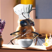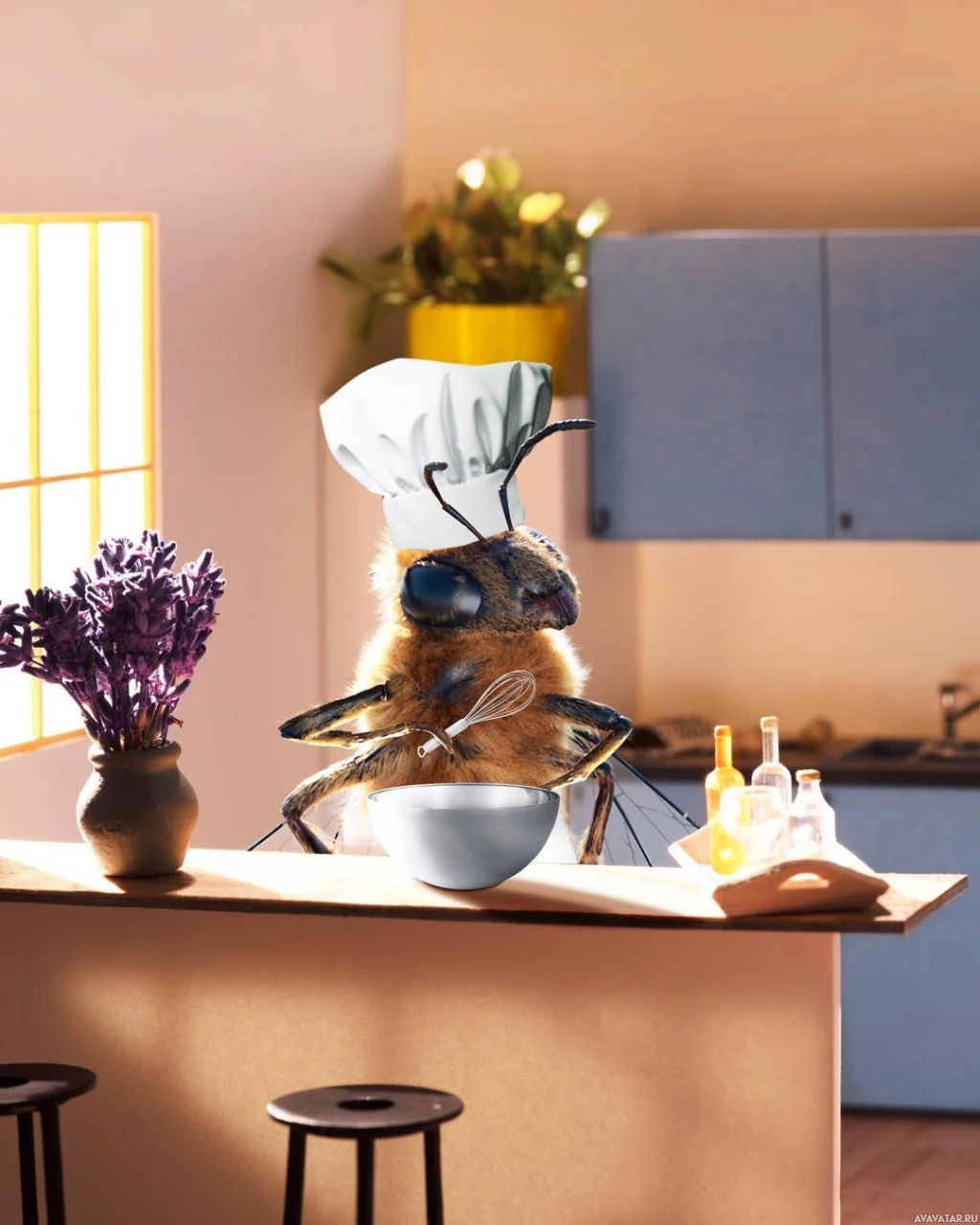 a dining table within a house environment. This image combines elements of an insect (bee) with human-like activities associated with cooking or baking, creating