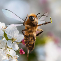cherry trees. The bee is likely visiting the flowers for pollen or nectar, which are essential sources of nourishment for these insects. The focus on the bee and the delicate pink petals of the cherry blossoms creates a serene and picturesque scene that captures