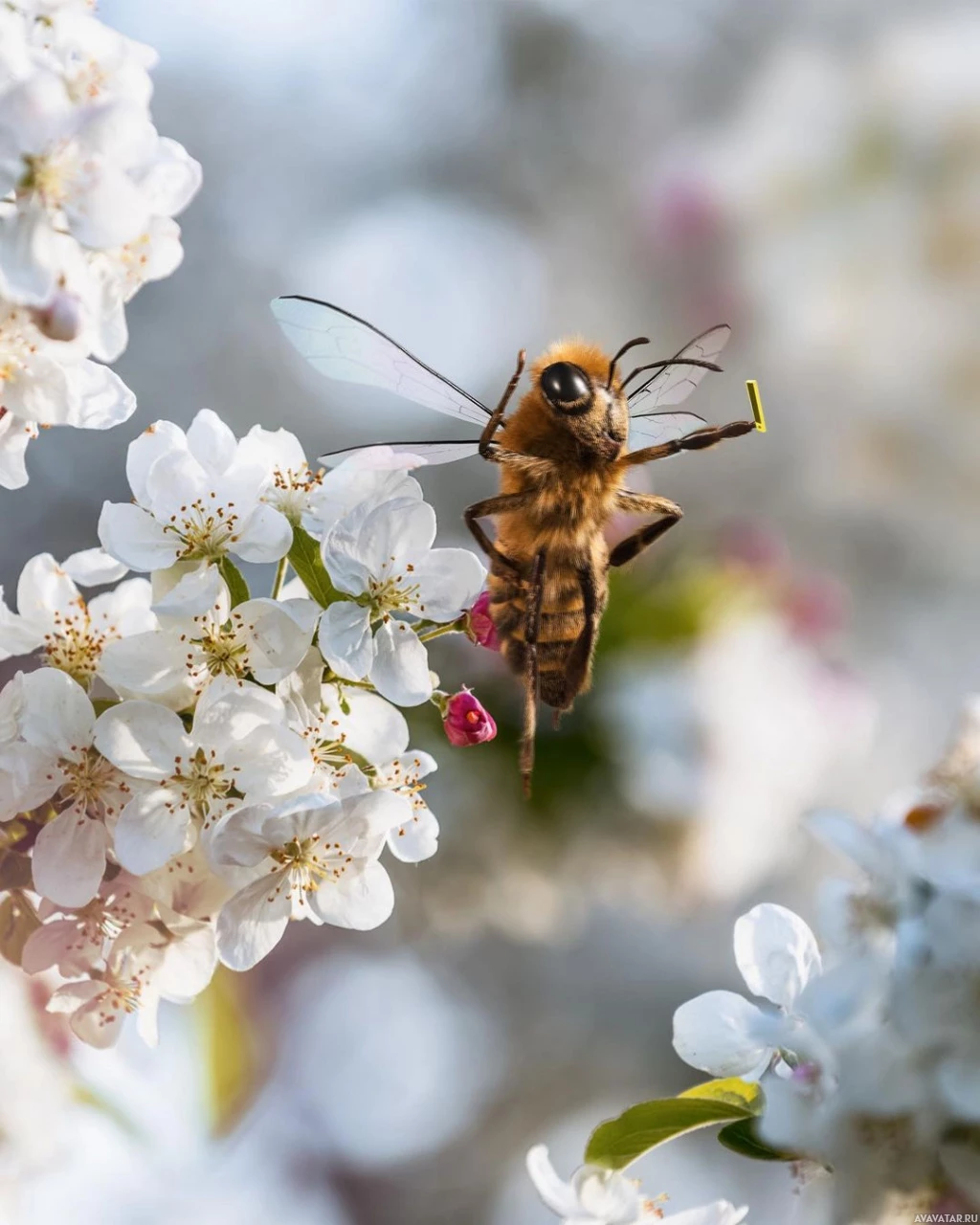 The image shows a bee hovering in the air, surrounded by blossoming