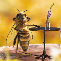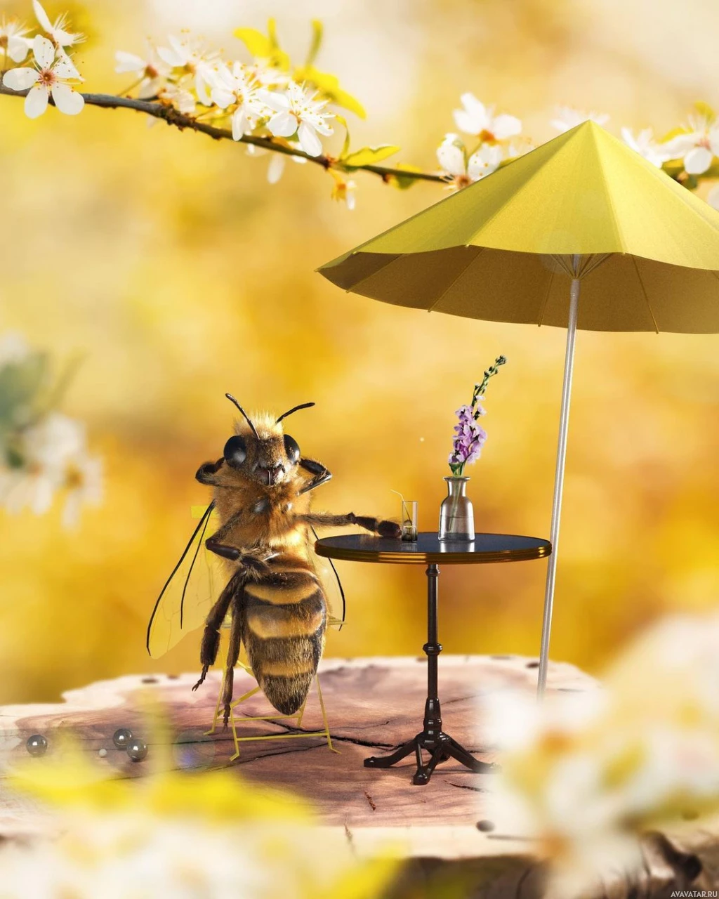 an anthropomorphic bee seated at a table outdoors. The bee is wearing a pair of sunglasses and appears to be relaxing, with a drink in front of it on the table. There's also a yellow umbrella providing shade, suggesting it might be a warm