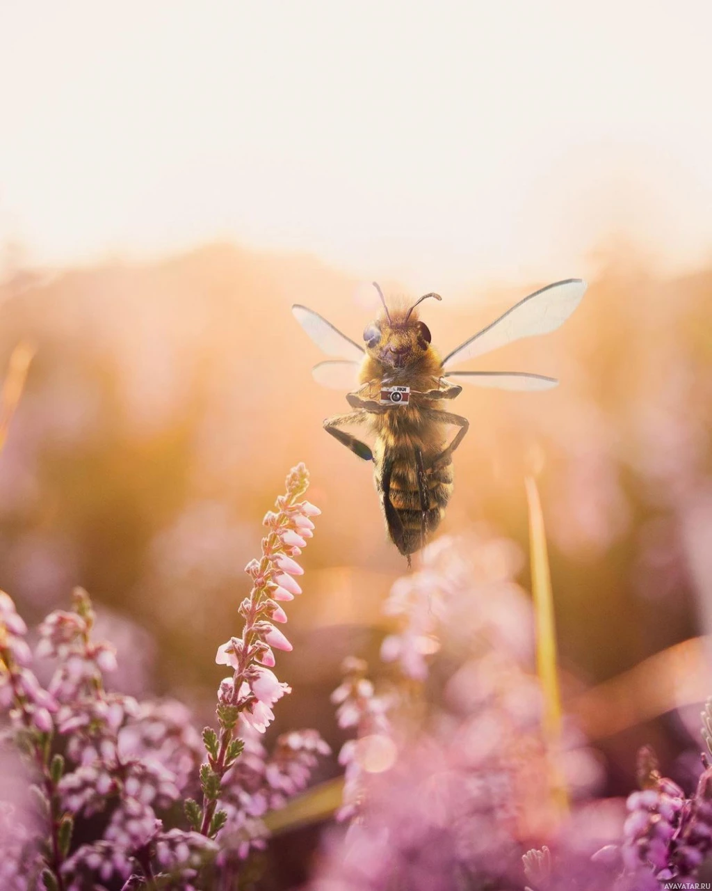 На картинке изображена пчела в полете во время восхода или заката солнца, а фон освещен теплым светом. Пчела запечатлена на фоне фиолетовых цветов и травы. На этом снимке запечатлен момент из жизни пчелы и показана ее естественная среда обитания.