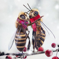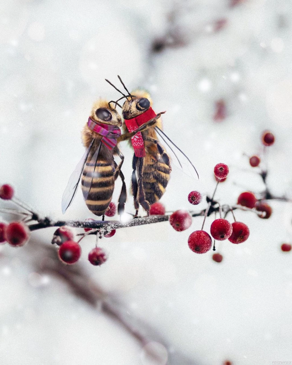 red berries. One bee is positioned behind the other, and they appear to be facing each other as if interacting or perhaps dancing. The background suggests it's a snowy environment, which contrasts with