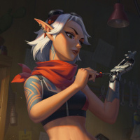 white hair with blue eyes. Her expression seems thoughtful or focused, and she's holding what looks like a tool in her hand, possibly indicating a crafting or repair activity. In the background, there are shelves filled with various items that suggest this character is working in some sort of workshop or laboratory setting, which aligns with the fantasy theme. The image is well-rendered, suggesting it might be from
