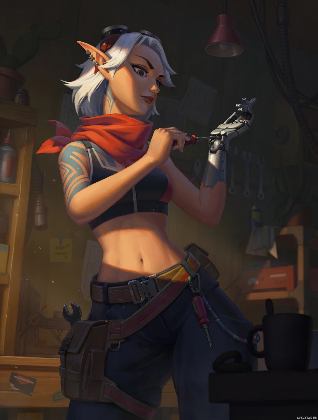 a fantasy elf. She is wearing a sleeveless top and has