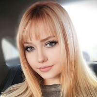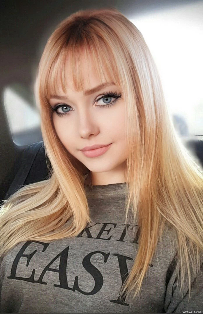 blonde hair and is wearing makeup, including prominent eyelashes and blue eyeshadow. She's smiling at the camera, giving off a friendly and approachable vibe. There is text on her sweatshirt that reads "Keep it easy," which seems to be part of the branding or design of her clothing. The background is blurred but appears to be