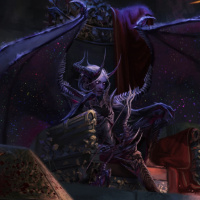 the seated figure is a creature with bat-like wings, often referred to as a succubus in fantasy lore, who is holding what seems to be a scroll. The succubus has a humanoid form, suggesting she might be a powerful being within this
