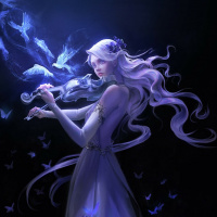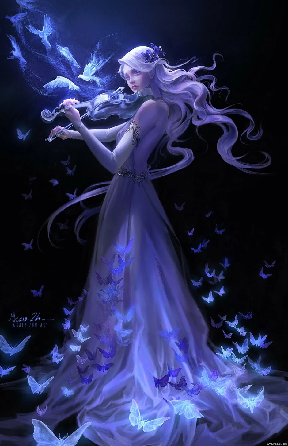 a flowing gown that matches her ethereal appearance, and she is playing the violin, which is being held close to her chest. Surrounding her are butterflies of