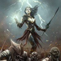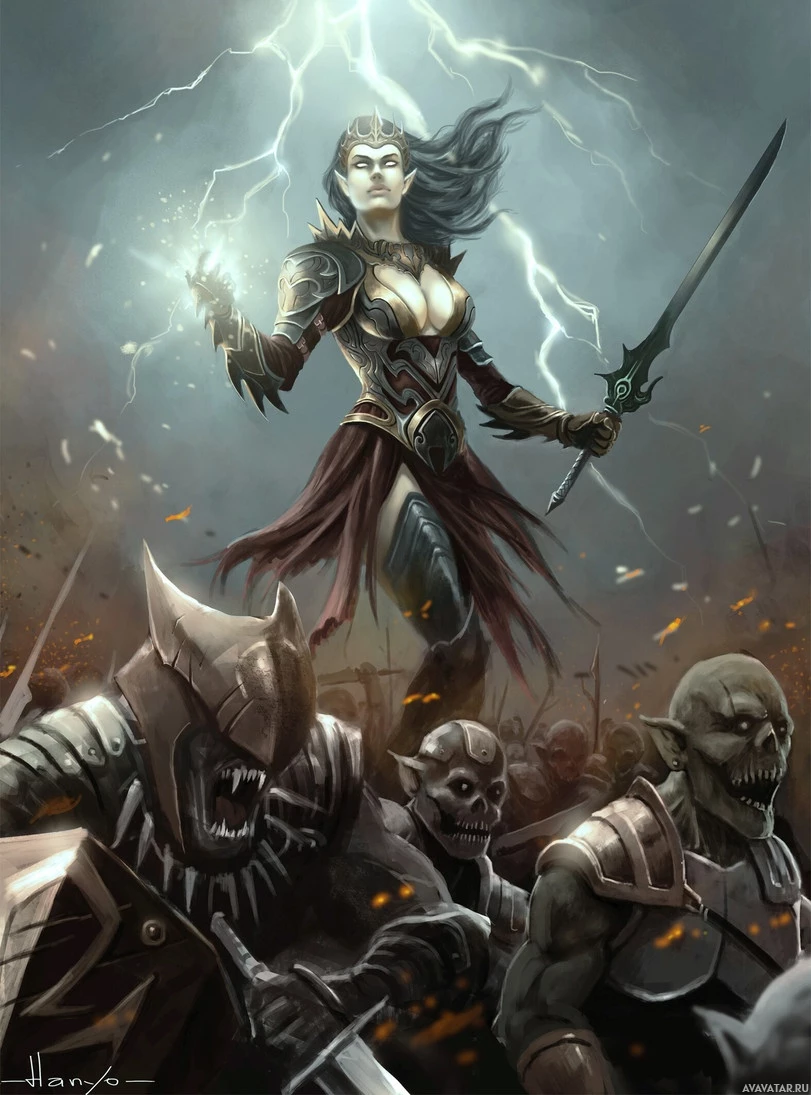the fantasy world. In her hand, she's casting a spell with lightning bolts surrounding her, indicating she may have