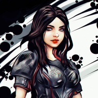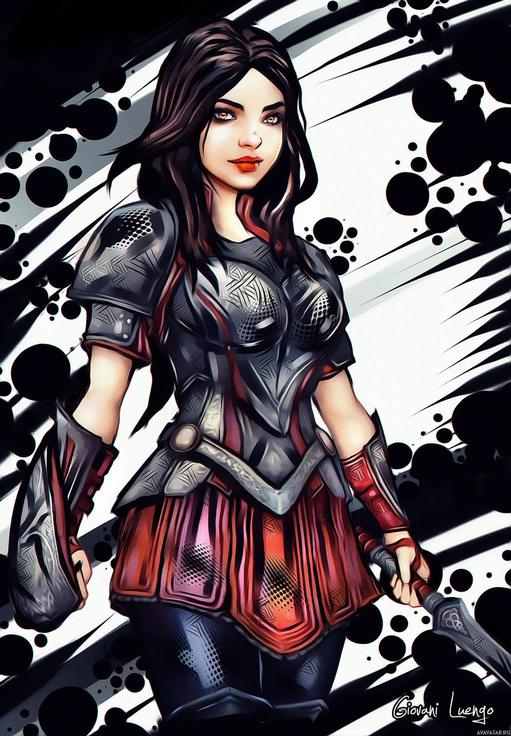 На картинке изображен женский персонаж, выполненный в художественном стиле со смелыми очертаниями и яркими цветами. Она изображена в доспехах, что позволяет предположить, что она могла быть воином или персонажем из фантастического или исторического контекста. У нее каштановые волосы и серьезное выражение лица. Фон включает в себя цветные вкрапления и абстрактные формы, что придает изображению динамичный характер.