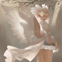 The image features a fantasy-themed illustration of an angel. The character is depicted from behind, showing off her wings and ethereal presence. She appears to be standing amidst a graveyard scene with numerous skeletons around her. Her outfit has a white color scheme that suggests purity or celestial attributes. The art style is detailed and evokes a sense of mysticism and otherworldly beauty.