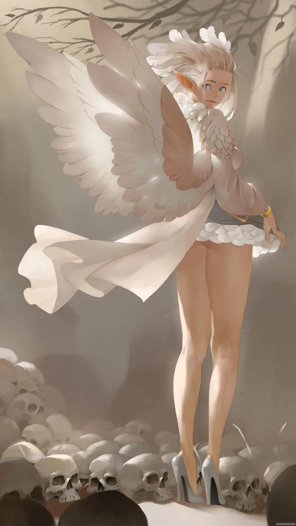 На картинке изображен ангел в стиле фэнтези. Персонаж изображен сзади, демонстрируя свои крылья и неземное присутствие. Кажется, что она стоит посреди кладбища, окруженная многочисленными скелетами. Ее наряд выполнен в белой цветовой гамме, что наводит на мысль о чистоте или небесных атрибутах. Художественный стиль детализирован и вызывает ощущение мистицизма и потусторонней красоты.