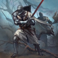 medieval warriors or knights. They are holding swords and shields, which suggests that they are engaged in a battle or a martial activity. The background has