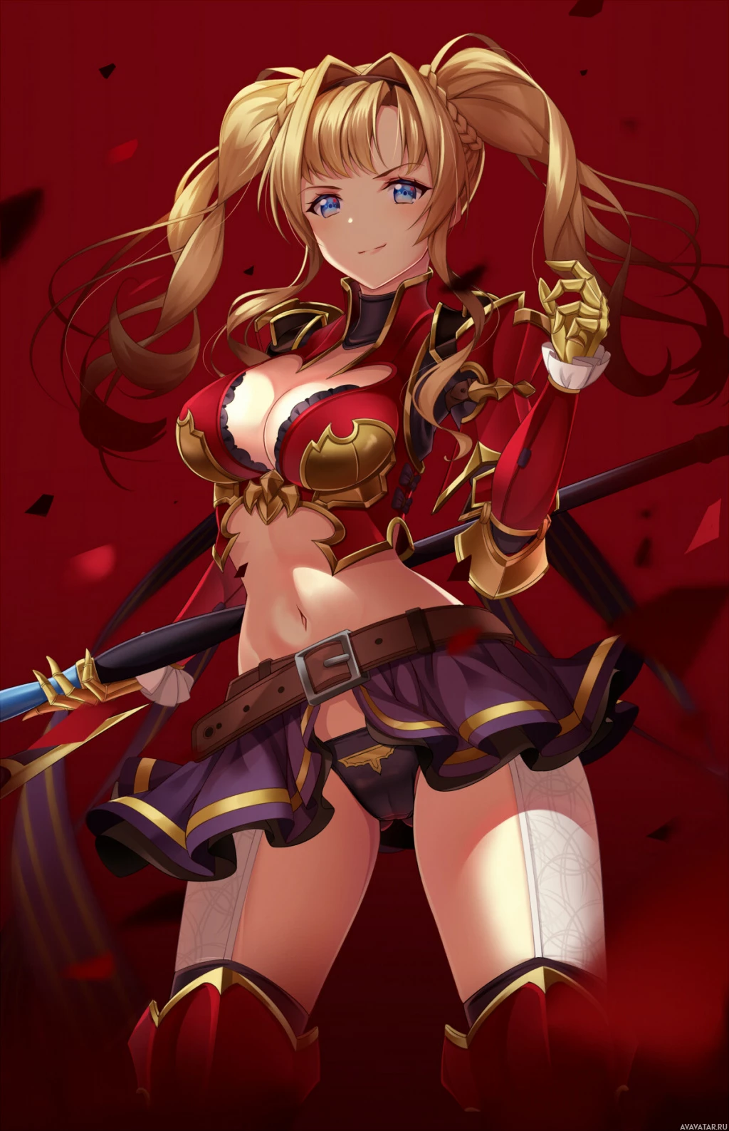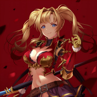 blonde hair styled in twin tails and wearing a red armor with golden accents, including gauntlets and boots. The outfit has a fantasy-themed design, suggesting she might be a warrior or a character of significance in her respective