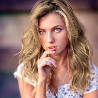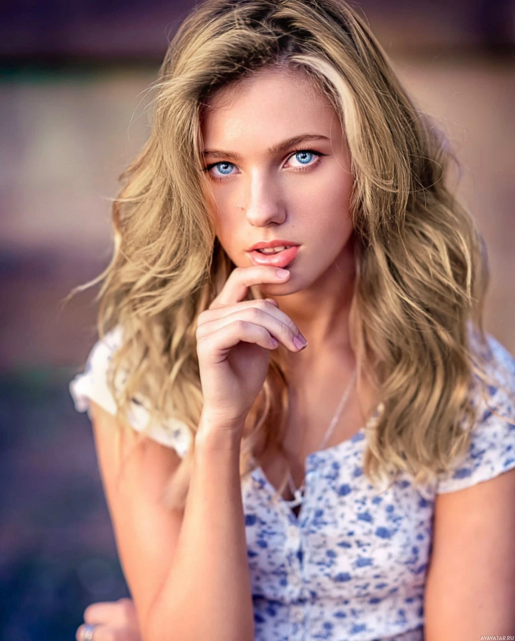 На картинке изображена молодая женщина, позирующая перед камерой. У нее длинные волнистые светлые волосы и легкий макияж с голубыми тенями для век. Выражение ее лица нейтральное, губы слегка приоткрыты, что придает ей задумчивый вид. На ней надето что-то похожее на джинсовый топ с цветочным рисунком.