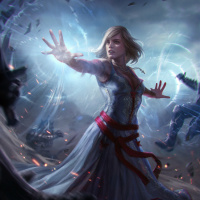 Triss Merigold in the game. She is depicted in a dramatic and intense pose, holding up her hand as if casting a spell or stopping an attack. The background suggests a chaotic