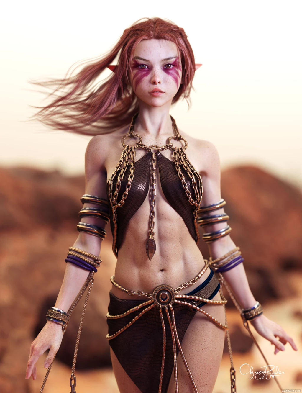 a fantasy character that appears to be a red-haired elf. The character is wearing