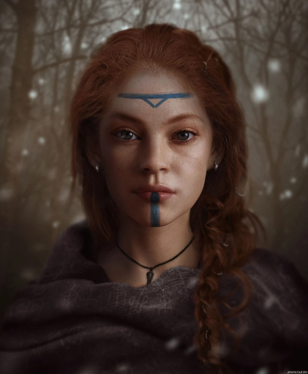 red hair, wearing what appears to be historical or fantasy-inspired clothing. She has a tattoo or mark on her forehead that resembles