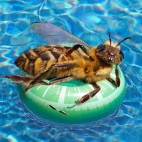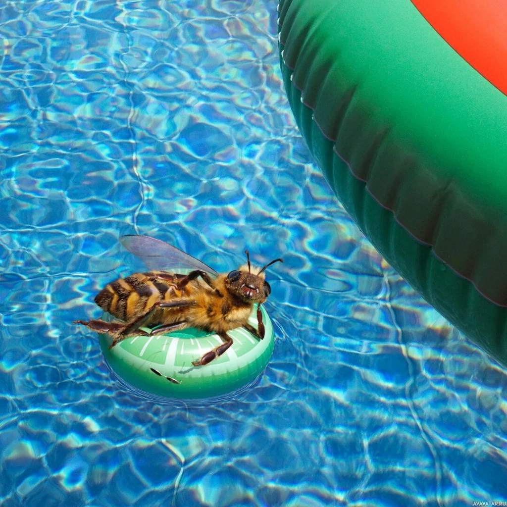 a pool ring. This is an unusual sight because bees are not typically associated with swimming or being in water. Bees are insects, and they are known to play various roles such as pollination and