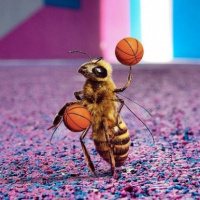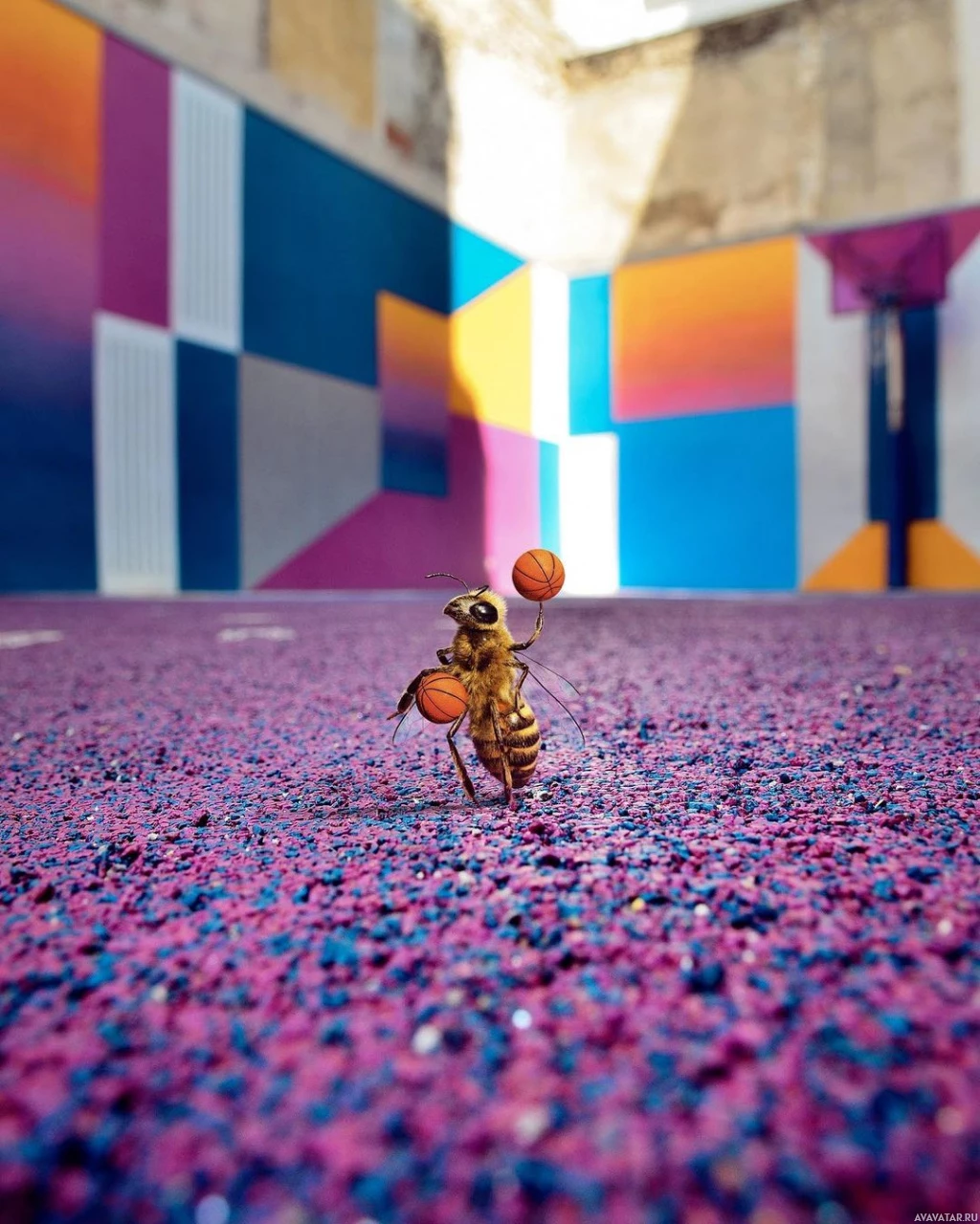 На картинке изображена пчела, которая является насекомым, стоящим на чем-то, напоминающем разноцветную поверхность, с баскетбольным мячом в руках. Это необычное сочетание было обработано цифровыми средствами или инсценировано для создания художественного или юмористического эффекта. В природе такого не встретишь, поскольку пчелы не играют в баскетбол.