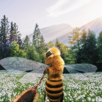 the warm lighting. The image also has a superimposed or edited element that gives the appearance of a bee wearing a pair of wings as if it is flying through the air. This creates