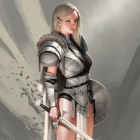 The image shows a digital illustration of a female warrior. She is wearing silver armor and holding a sword, suggesting she might be a character from a fantasy or historical setting. Her pose indicates that she is ready for battle. Her long blonde hair adds to her heroic appearance.