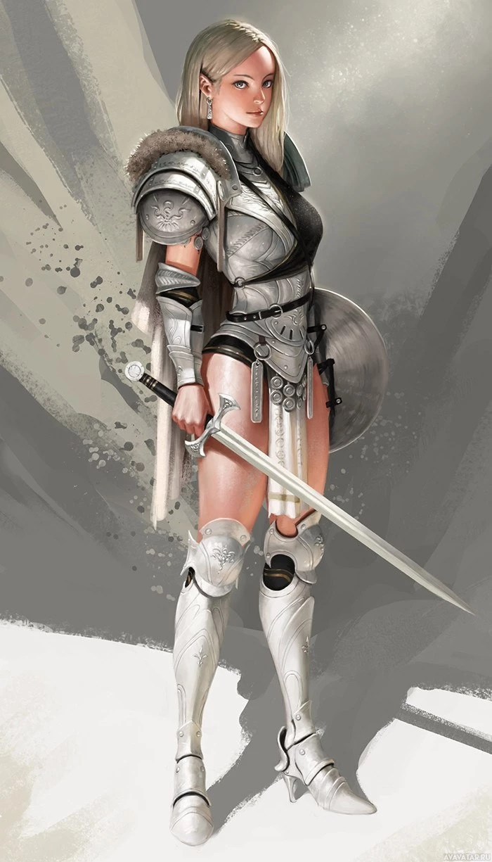 На картинке изображена цифровая иллюстрация женщины-воина. Она носит серебряные доспехи и держит меч, предполагая, что она может быть персонажем из фэнтези или исторической обстановки. Ее поза свидетельствует о том, что она готова к бою. Ее длинные светлые волосы дополняют ее героическую внешность.