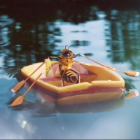 На картинке изображена маленькая лодка, вероятно, сделанная для детских игр. Внутри лодки находится пчела, которая является насекомым. Это необычное зрелище создает причудливую и неожиданную картину, поскольку пчелы обычно не ассоциируются с деятельностью в детской лодке.