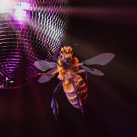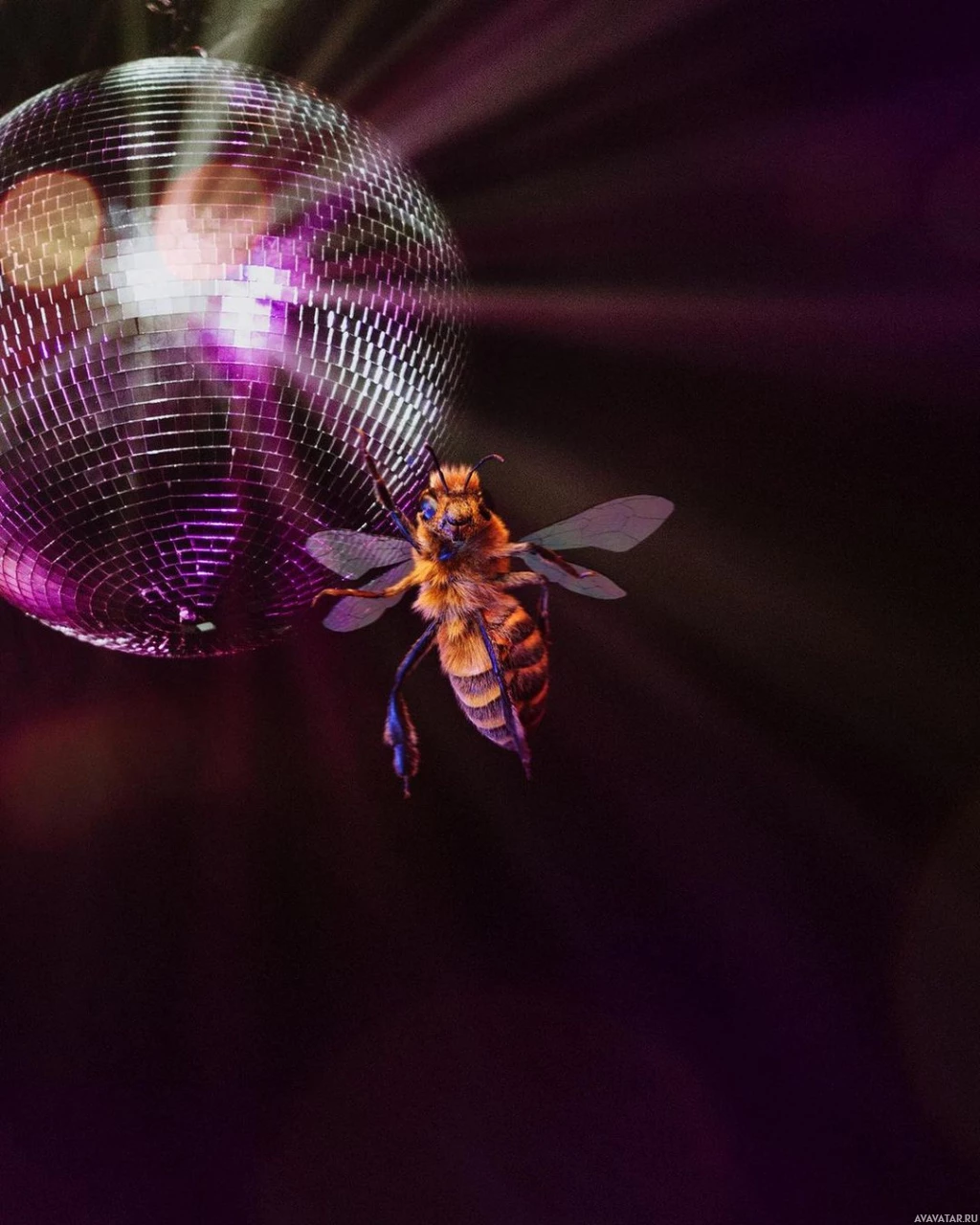 a disco ball. The disco ball is illuminated with purple and white lights, creating a reflection on the surface. This scene creates a whimsical or surreal atmosphere, as it's unusual to see a bee interacting with such a human-made object typically associated with entertainment settings like discotheques.