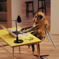 various objects on the desk such as books, a lamp, and what appears to be a pair of scissors. This scene plays on the idea of anthropomorphism, giving human characteristics to animals, in this case, making it seem as if the bee is using the computer like a person would.